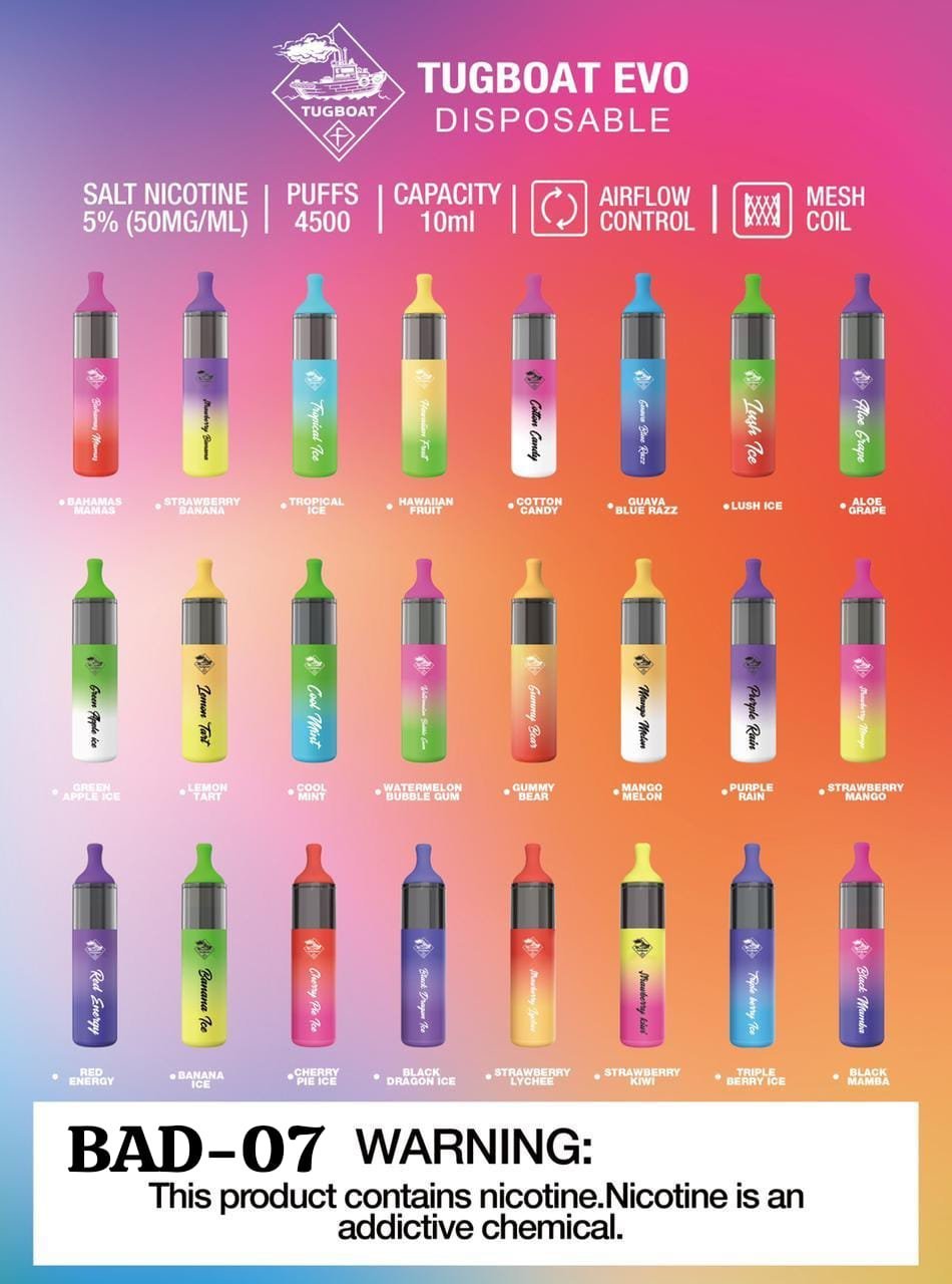 Shop the Tugboat EVO Disposable vape Dubai. Tugboat EVO Disposable is powered by an 850mAh internal battery, which results in greater longevity and stability. With a 10ml e-juice capacity.